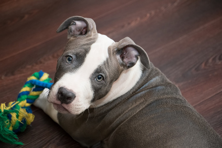 坐在棕色的地板上的白色和灰色的比特犬照片 正版商用图片1fh2zn 摄图新视界